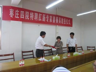 院长李怀章同志为姜春英教授予颁发聘书落实三名战略造福枣庄人民为提升全市人民肛肠疾病的诊疗水平,使肛肠病患者不出门就能享受国家级肛肠专家的诊治技术,我院积极贯彻市卫生局三名战略,在与卫生部中日友好医院肛肠科合作的基础上,近日又与山东省中医药大学联系,聘请全国知名肛肠专家、山东省中医药大学博士生导师姜春英教授来我院坐诊。8月19日上午,医院为姜春英教授举行了隆重的聘任仪式,院长李怀章同志为姜春英教授频发...