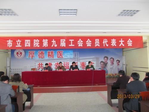 枣庄市立四院召开第九次工会会员代表大会2013年3月29日,枣庄市立四院在门诊楼三楼会议室召开了第九次工会会员代表大会,市卫生局沈象胜副局长莅临指导,38名工会会员代表参加了会议,会议由纪委书记殷宜文同志主持。上午九时召开了预备会议,大会推选了大会主席团执行主席、通过了大会议程、听取并通过了关于代表资格审查的审查报告。下午三时,正式会议在庄严的国歌声中开幕,市卫生局副局长、市医务工会主任沈象胜同志发表祝贺词...